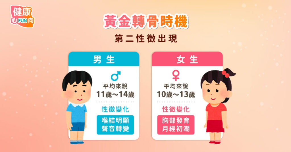 - 男生調理時機:建議在11歲至14歲之間開始服用,但需視個人發育狀況而定。當出現喉結開始變明顯、聲音轉變、手腳突然長高或身體明顯變壯等青春期初期徵兆時,就可以開始轉骨調理。可安排持續服用1~2年的時間。